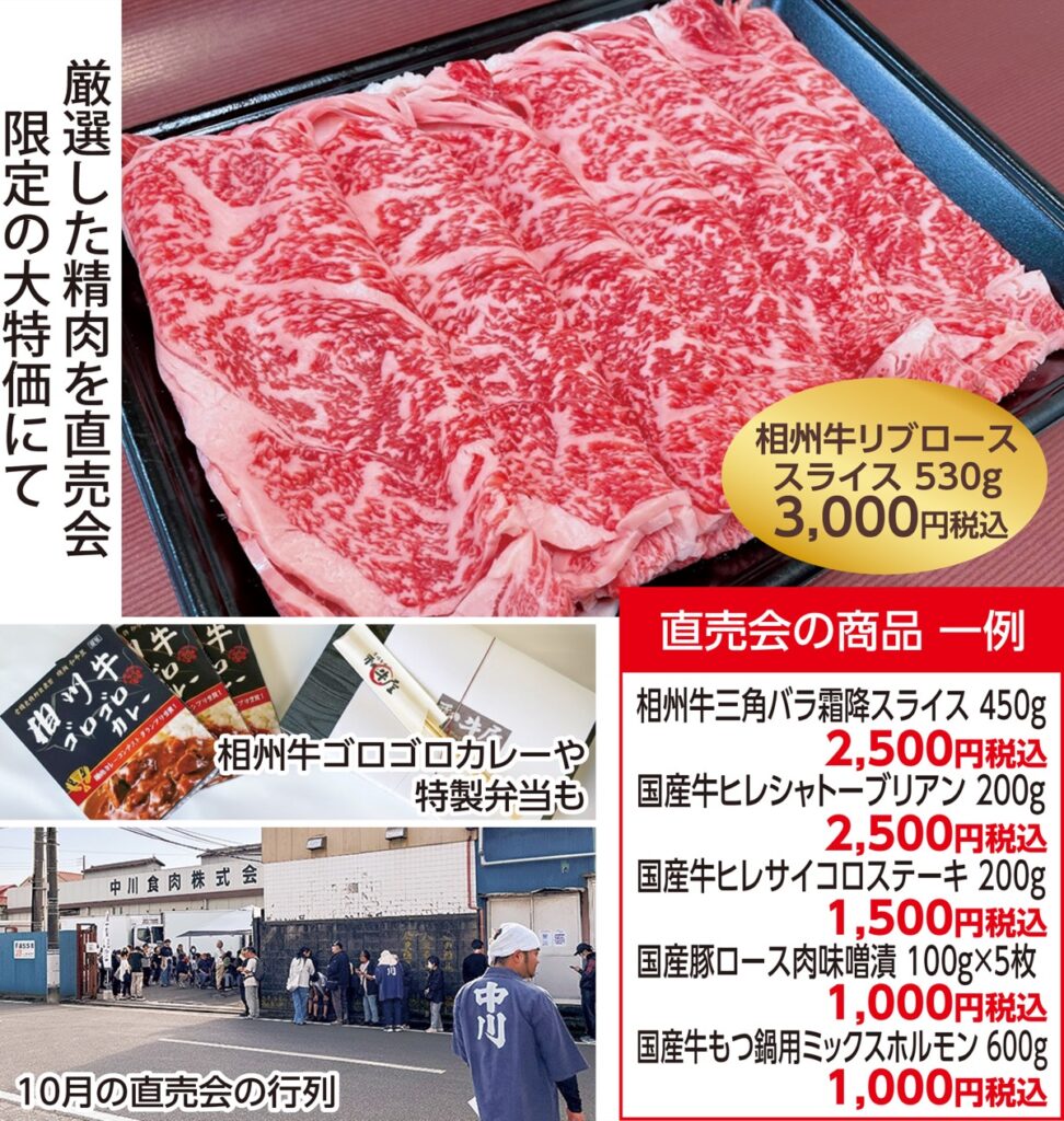 2025年11月22日 【数量限定】老舗肉卸問屋 中川食肉 の直売会 11月29日 (土) 開催! 11月29日(土)「いい肉の日」に開催! 日頃のご愛顧への感謝を込めまして、中川食肉の取り組みとなります直売を11月29日(土) 「いい肉の日」に開催致します!全てのお品は数量限定にて、無くなり次第終了!今回はブランド牛「相州牛」リブローススライスをはじめ、地元神奈川の牛豚を中心に16品程を予定しています。直売ならではの特別価格で販売いたします!!11月29日(土) 「いい肉の日」に、ぜひ中川食肉の「いい肉」をお楽しみください! タウンニュースでも取り上げて頂きました! タウンニュース(2025年11月22日掲載) 直売について 販売日程:11月29日 (土) 09:00 〜 12:00店頭販売のみとなります。※事前のご予約・お取り置き等はできません※全て数量限定、無くなり次第終了となります。※以降、月1回 土曜開催(予定) お支払い方法 現金のみ アクセス・駐車場 <住所>〒250-0004 神奈川県小田原市浜町4丁目27−6<駐車場>中川食肉(本社)向かいの駐車場をご利用ください(10〜15台駐車可能) お知らせ 相州和牛相州牛