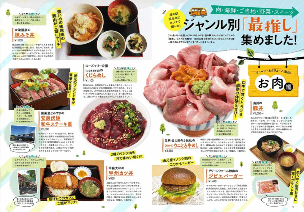 ドライブをする際、目的地としても人気のある「道の駅」。地元でとれた新鮮な野菜、海から揚がったばかりの魚介、手間暇かけて育てられたブランド肉などを使った料理は、出かけてまで楽しむ価値があります。巻頭特集では、各駅の名物グルメを「肉」「海鮮」「野菜」「スイーツ」「ご当地名物」の5つのジャンルに分けて紹介します。